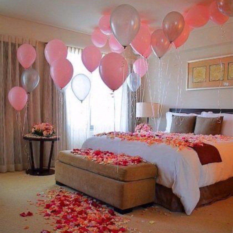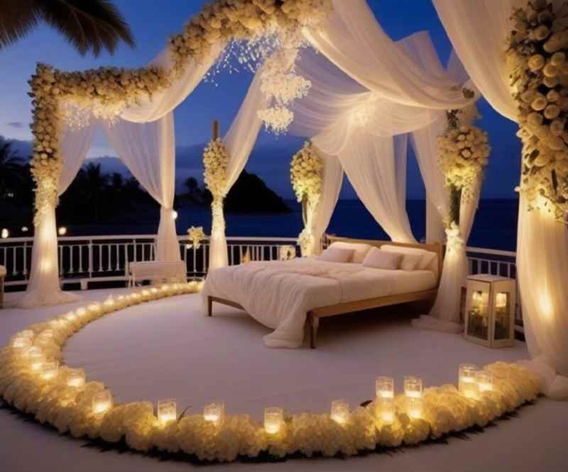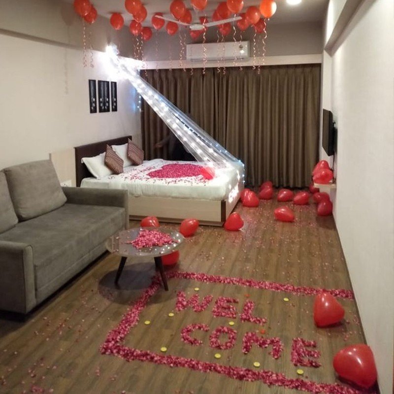 Transform your first night room into a magical and romantic haven with thoughtful decoration. Use soft, warm lighting like fairy lights or candles to create a cozy ambiance. Scatter fresh rose petals on the bed and floor for a touch of elegance and romance. Add plush cushions, silky bed sheets, and a light throw to make the space inviting and comfortable. Include a few personal touches like framed photos, a small gift, or scented oils to enhance intimacy. Gentle music in the background can complete the mood. The key is a blend of romance, comfort, and personal charm for an unforgettable evening.